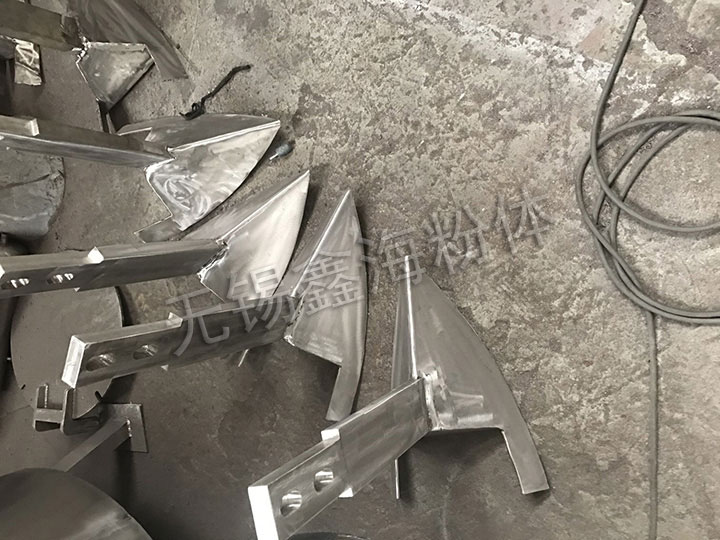 臥式犁刀混合機啟動后犁刀由犁刀軸帶動旋轉,使物料沿筒體徑向作周向湍動,同時把物料沿犁刀兩側面的法線方向拋出。當被拋出和作周向湍動的物料流經飛刀組時,被高速旋轉的飛刀迅速、有力地拋散。物料在上述犁刀和飛刀的復合作用下,不斷重疊、擴散、在短時間內達到均勻混合,混合精度高。對需要固—液混合的物料,混合液體通過噴液裝置均勻噴灑在筒體內運動的物料上。